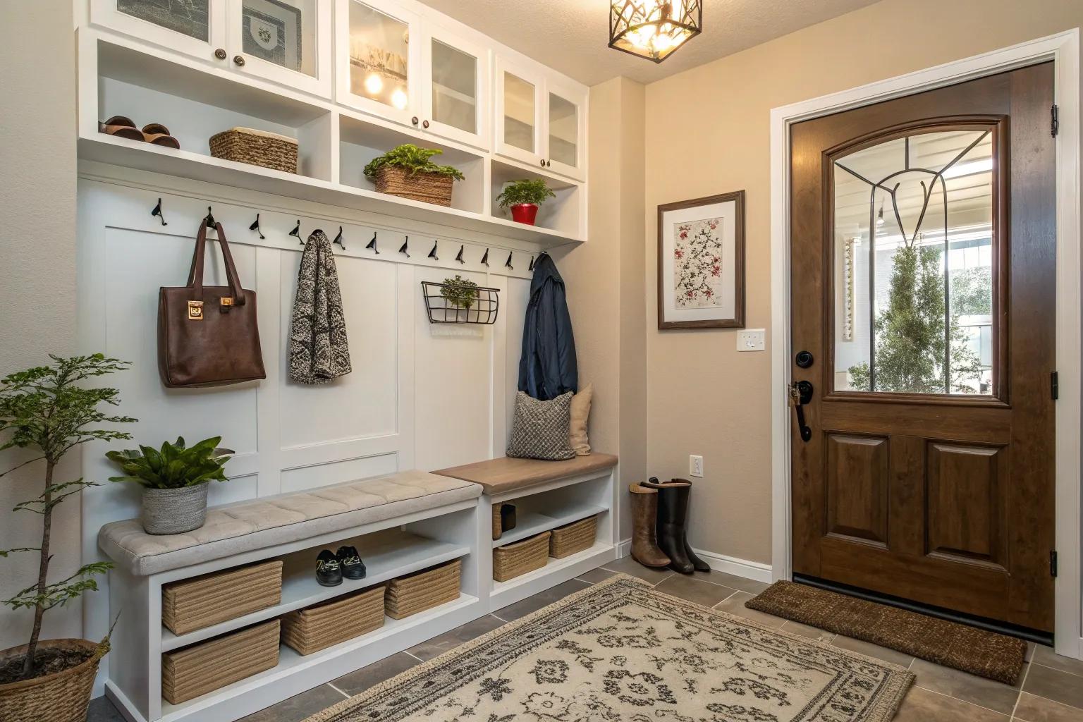 Incorporating built-in shelving or cubbies into your entryway design maximizes vertical space and creates a polished, integrated look. These units are perfect for storing seasonal gear or displaying personal mementos, such as framed photos or small plants, adding warmth and personality to the space.