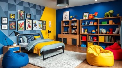 Celebrate your love for basketball with a themed bedroom that balances enthusiasm and elegance. Deep navy walls paired with vibrant orange accents and graphic elements like a court-line rug and framed jerseys create an energetic yet cozy retreat.