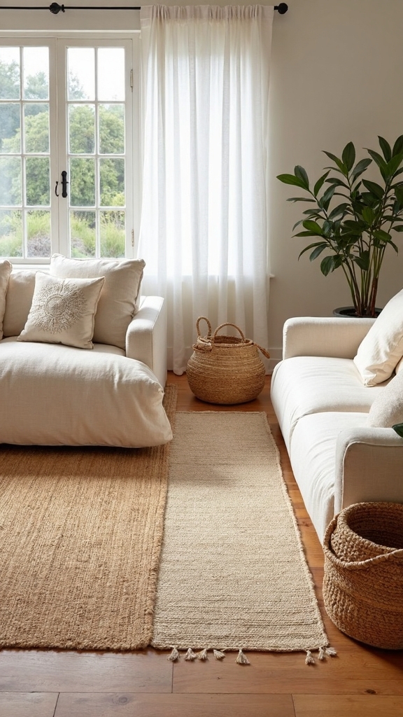 Layering rugs transforms your living room into a sophisticated Japandi sanctuary. Start with a large, neutral jute rug and add a smaller patterned wool rug to introduce texture and depth without compromising simplicity.