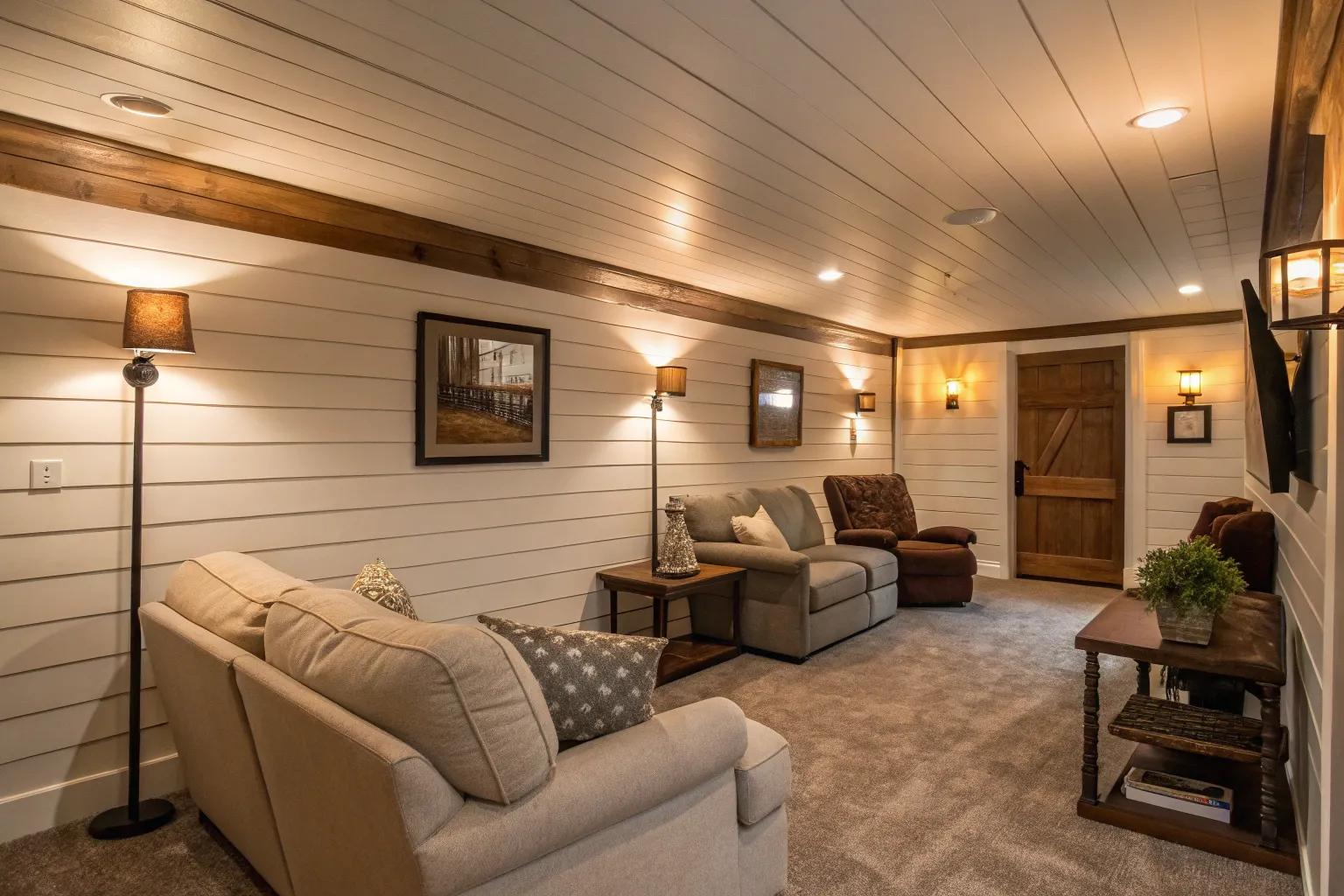 For a bold, contemporary look, choose dark shiplap combined with industrial accents like metal fixtures and exposed ductwork. This style adds depth and sophistication, especially suited for basement home theaters or lounges. The industrial chic trend is strong in 2024, blending raw materials with refined design.