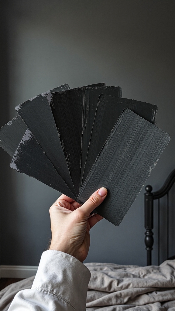 Mixing matte, satin, and gloss black finishes introduces layers of complexity that prevent your bedroom from feeling flat. Matte walls provide a solid base, satin bedding adds softness, and glossy furniture pieces reflect light to create depth.