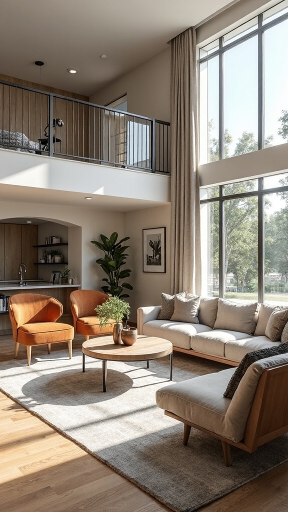 Installing curtains that stretch from floor to ceiling draws the eye upward, creating the impression of even taller ceilings and a more intimate atmosphere. This simple yet effective technique balances grandeur with coziness in your large living room.