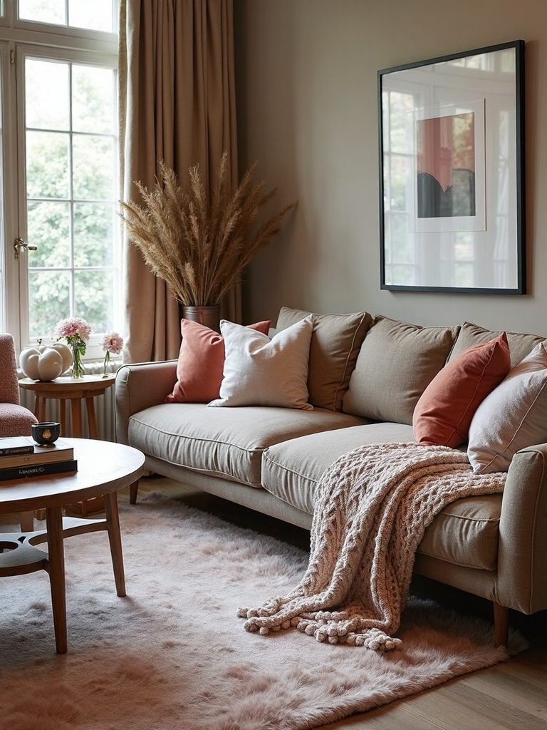 Vary artwork frames between sleek metals and rustic woods to create visual interest. Drape throws and stack pillows in different sizes and textures. Use books, plants, and candles at varying heights to add warmth and dimension.