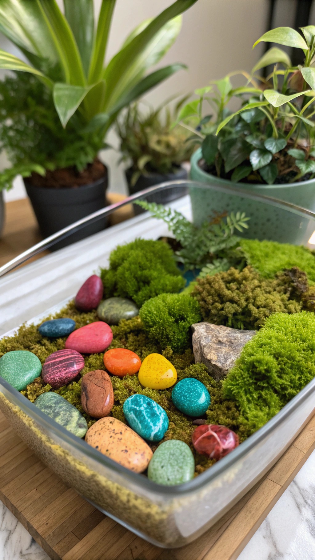 Incorporating decorative pebbles into your terrarium design adds a burst of color and tactile contrast, accentuating the lush moss. These stones serve as a creative outlet, allowing you to personalize your miniature garden with unique textures and hues. For a wide selection of decorative stones, explore options on Amazon.