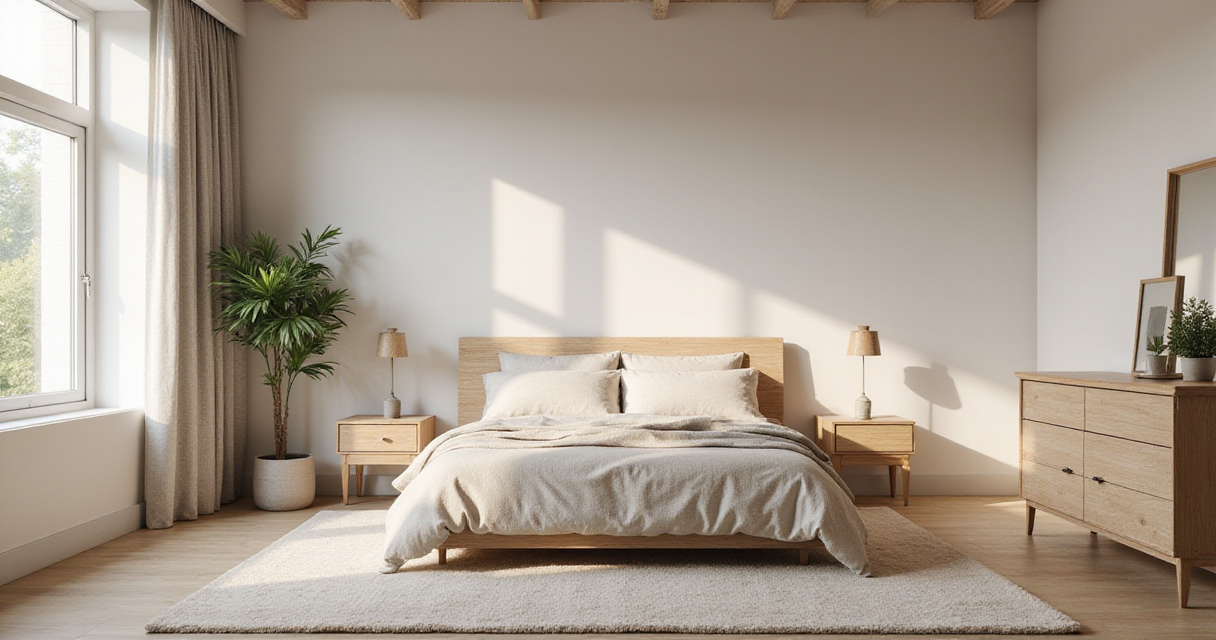 Start with a large jute or wool rug that extends under your bed and beyond. Avoid small “floating” rugs that shrink the room visually. Use unlined linen curtains to filter light and add movement.