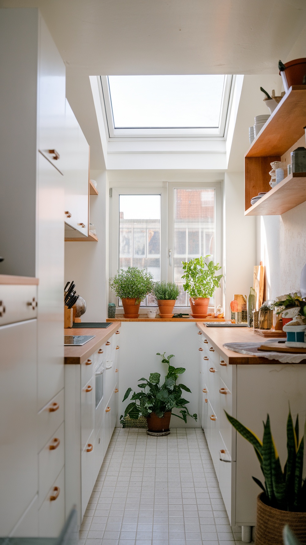 A skylight floods this compact kitchen with natural light, transforming it into a bright and cheerful space. White cabinetry and wooden countertops add warmth and simplicity, while potted plants on the windowsill introduce a refreshing natural element.