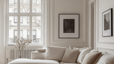 Choose an off-white and blush palette to cultivate a gentle, serene atmosphere. Incorporate warm lighting to add depth, and keep furniture minimal but textured. This design encourages relaxation and ease.