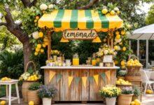 Enhance the stand’s appeal with floral arrangements and baskets brimming with lemons, complemented by a handcrafted sign that reads ‘Lemonade.’ This setup encourages socializing and fosters a relaxed ambiance, making it a standout element of your celebration.