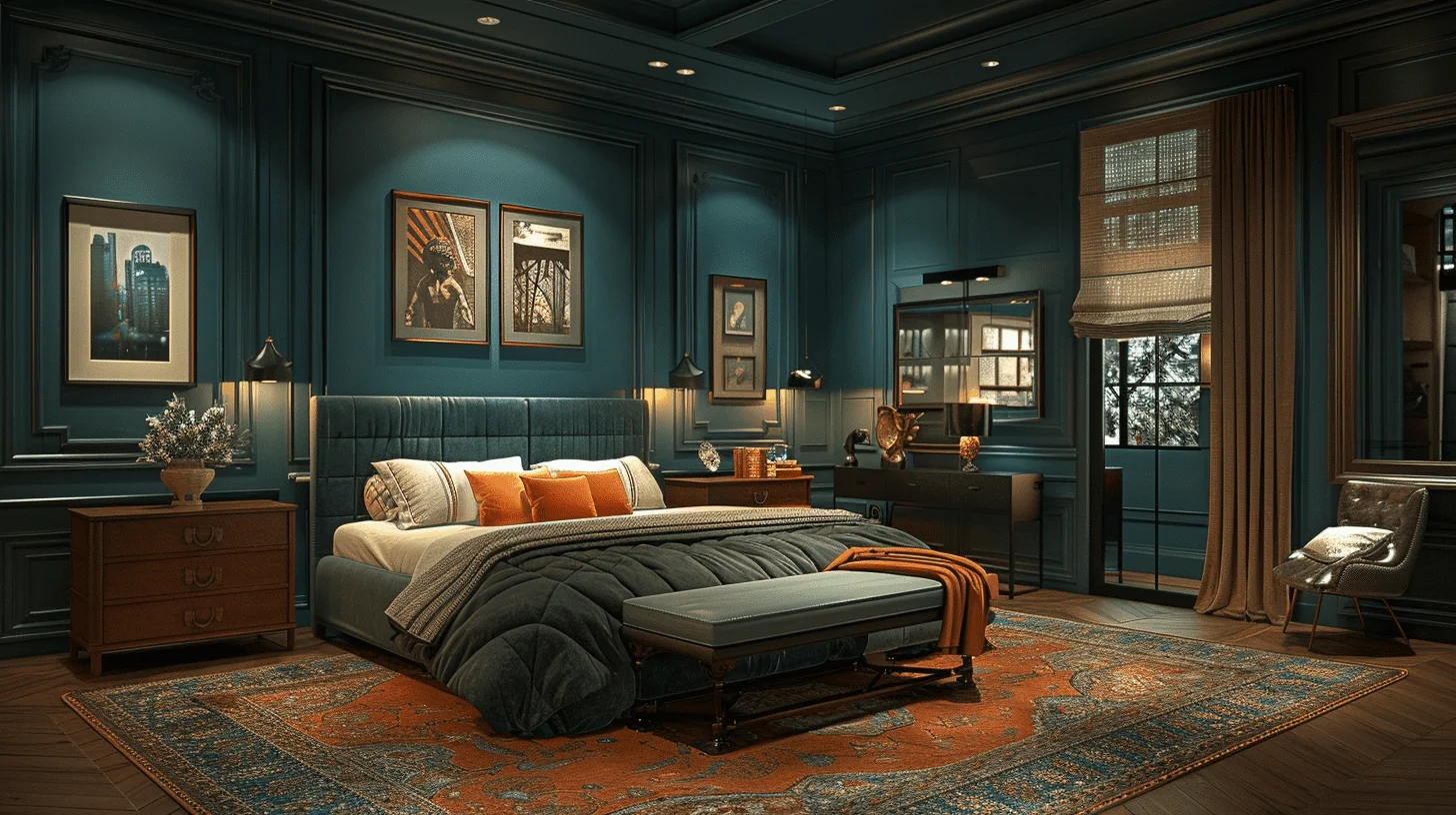 Ideal for city dwellers, this bedroom pairs dark teal with chic furnishings and bold patterns. Metallic finishes add a touch of glamour, creating a space that balances relaxation with the vibrant energy of urban life.