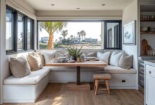 Design a cozy breakfast nook that captures the casual elegance of coastal living. Incorporate built-in benches with storage for beach essentials, topped with cushions in sun-resistant fabrics. Use a driftwood-inspired table paired with rattan or bamboo chairs. Large windows or glass doors enhance the airy feel by connecting the space to the outdoors.