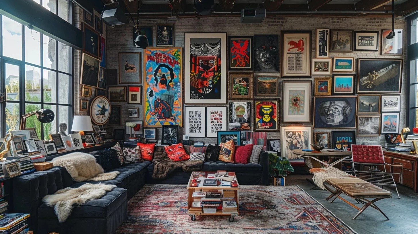 This living room doubles as a personal gallery, showcasing a wide array of street art and eclectic furnishings that tell urban stories. A mix of textures and artwork creates a rich, welcoming environment, perfect for collectors and art aficionados.