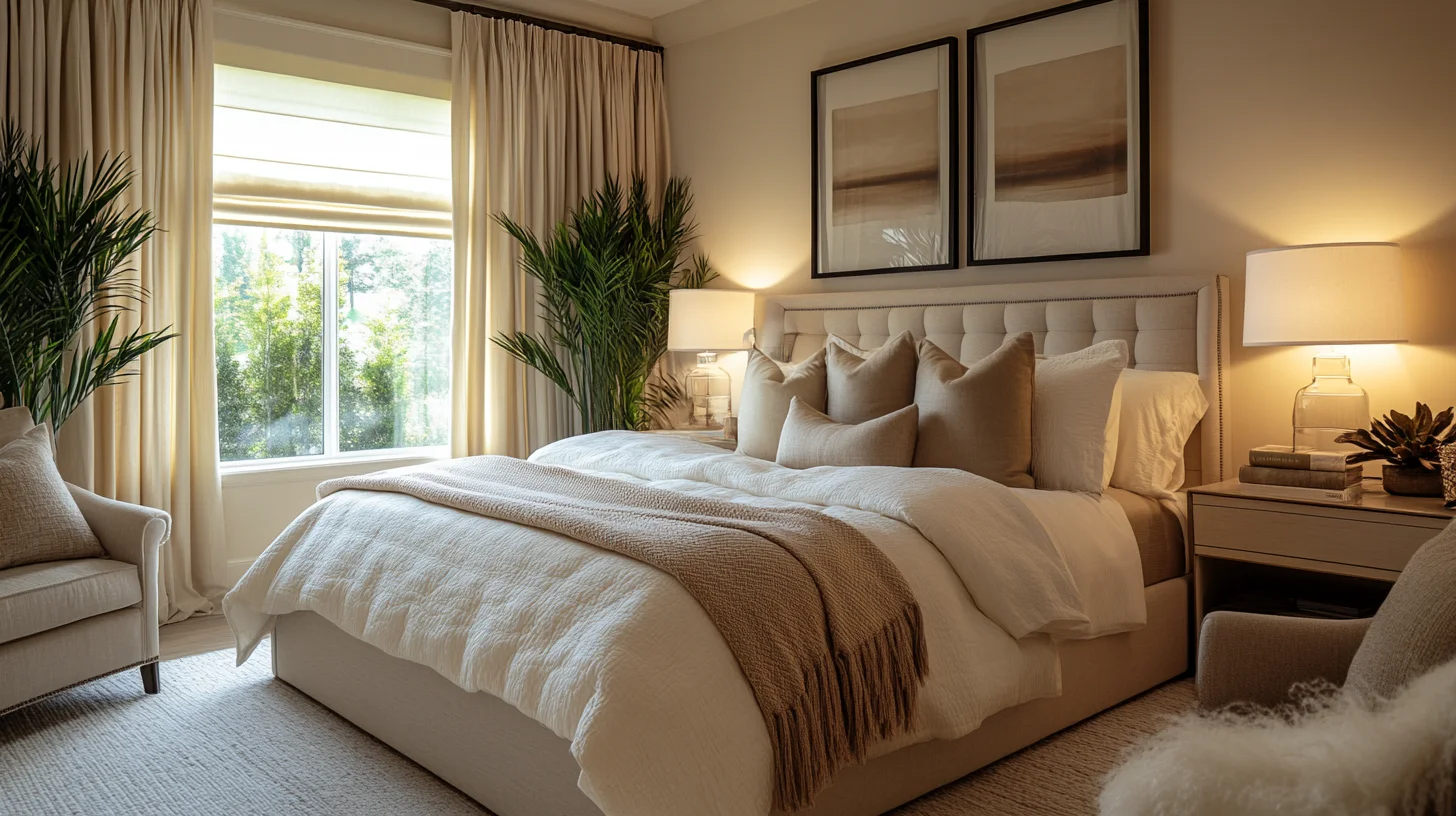 Ivory shades lend this bedroom a refined yet accessible charm. Smooth linens and understated patterns contribute to a luxurious feel without excess, while warm lighting accentuates the room’s inviting and sophisticated atmosphere.