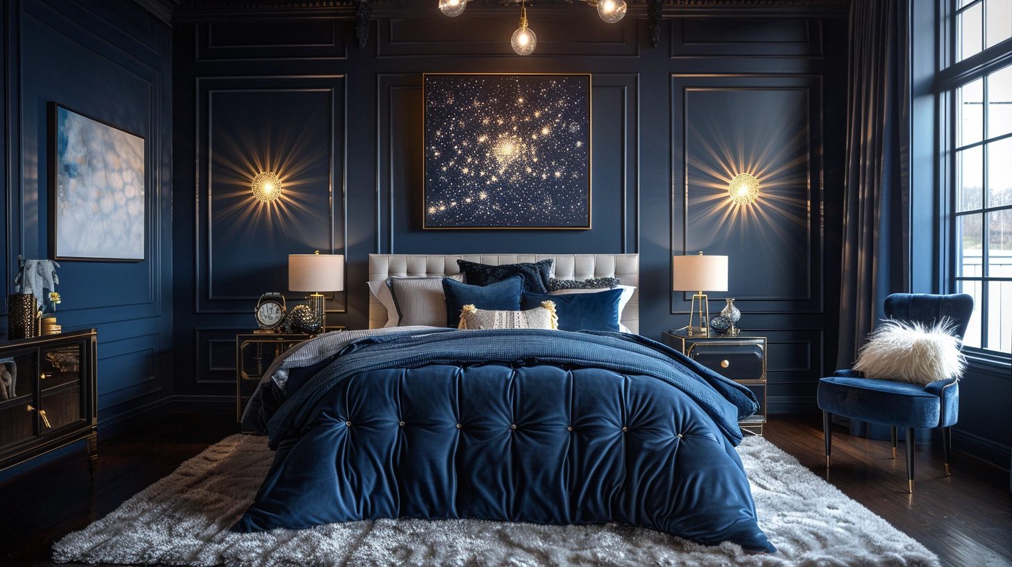 Sapphire Bliss incorporates deep, calming sapphire blues to establish a majestic and tranquil sleeping space. Complemented by lighter blues and soft grays, sapphire walls provide a soothing backdrop, while silver accents add a refined touch. Luxurious bedding and cozy throws complete this restful sanctuary.