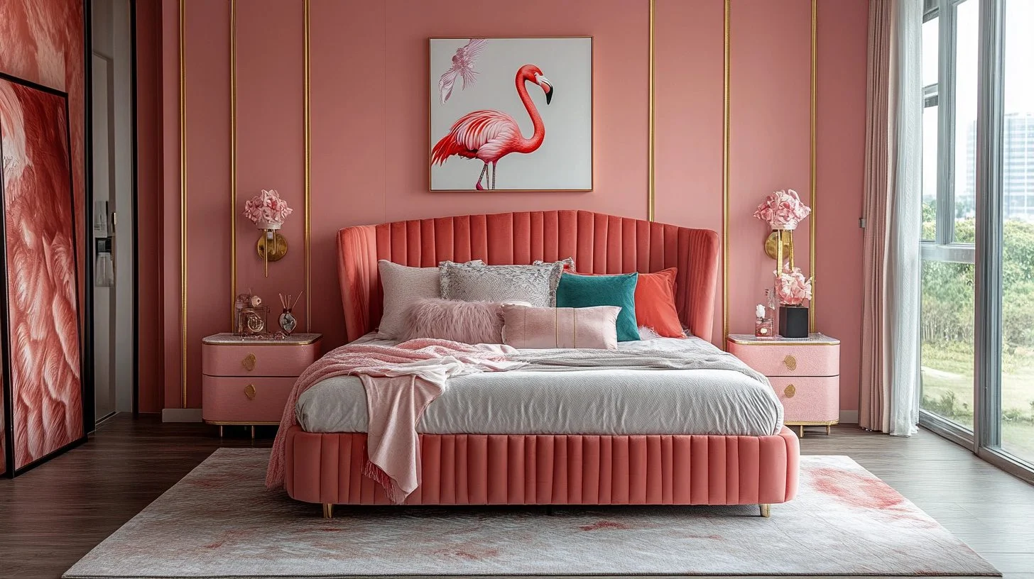 Channeling the playful elegance of flamingos, this suite incorporates vivid pink accents and feather-inspired textures. Artistic flamingo prints and sculptures add a whimsical touch, while the overall design balances fun with sophistication. This space is ideal for those who enjoy a lively yet chic bedroom environment.