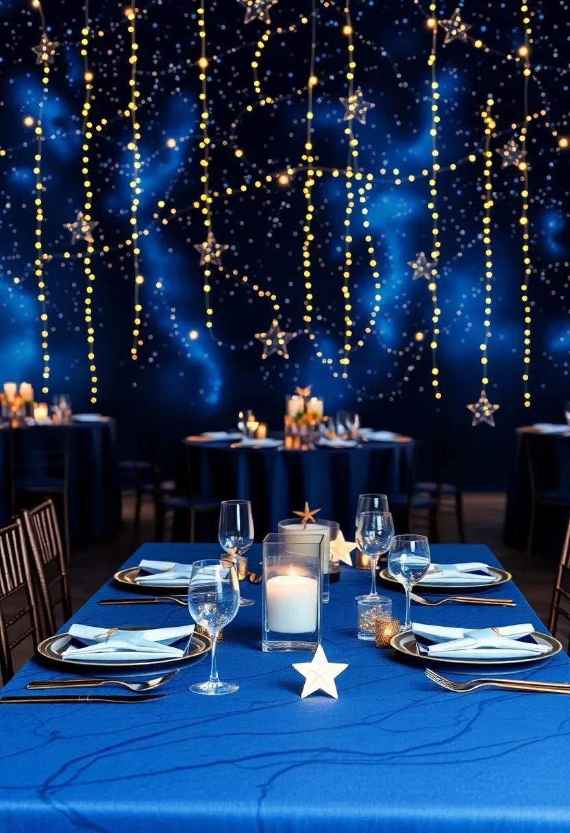 Celestial Themes: Inspire awe with a night sky motif, using deep navy tablecloths, twinkling fairy lights, and star-shaped centerpieces that create a magical ambiance for evening gatherings