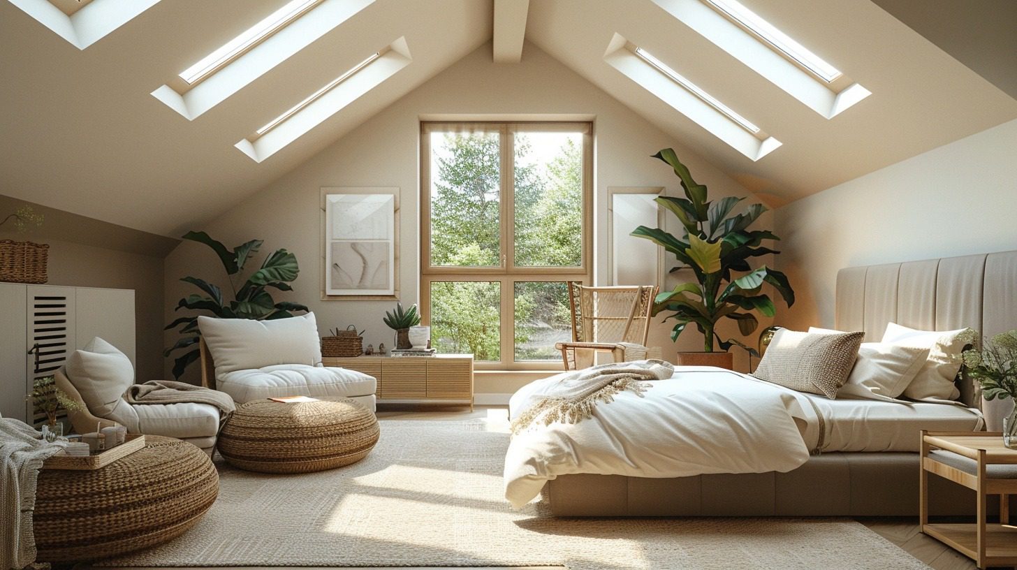 Utilize light wood tones, neutral colors, and space-saving Scandinavian furniture to create a clean, cozy attic bedroom. Large windows and minimalistic decor emphasize the Scandinavian ethos of functional, clutter-free living.