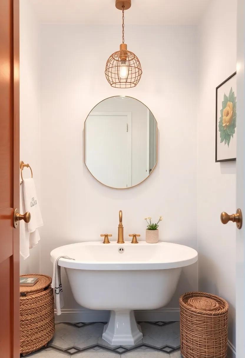 Transform your small bathroom into a stylish sanctuary by incorporating vintage-inspired mirrors that not only enhance decor but also create an illusion of space. Look for mirrors with unique shapes, such as sunbursts or geometric patterns, which can serve as stunning focal points while reflecting light around the room.The play of light from these mirrors can effectively open up your space, giving the appearance of a larger area. Consider various finishes—like aged brass or distressed wood—that complement your boho aesthetic.