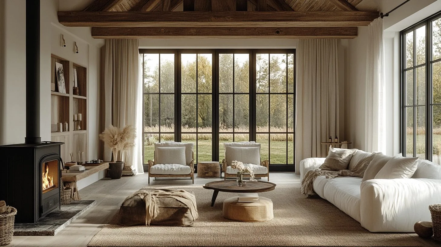 Nordic Homestead Vibes focus on creating a warm, inviting atmosphere reminiscent of a contemporary farmhouse. The palette centers on soft whites and grays, complemented by natural wood accents and cozy fireplaces that invite family gatherings. Layered textures, such as plush rugs and ambient lighting, enhance the comforting ambiance, making the home both stylish and livable.