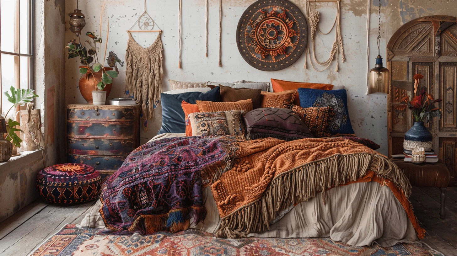 Indulge in a Luxurious Boho Bedroom Retreat with sumptuous bedding, plush cushions, and textured layers that envelop you in comfort and style.
