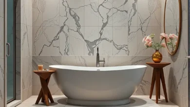 The Twilight Spa Bathroom captures the essence of moody design with budget-conscious dark matte tiles and the soft glow of candlelight, evoking the calmness of dusk. Matte black fixtures, affordable yet stylish, add a luxurious feel. This theme transforms your bathroom into a serene spa-like retreat, ideal for unwinding in elegance.