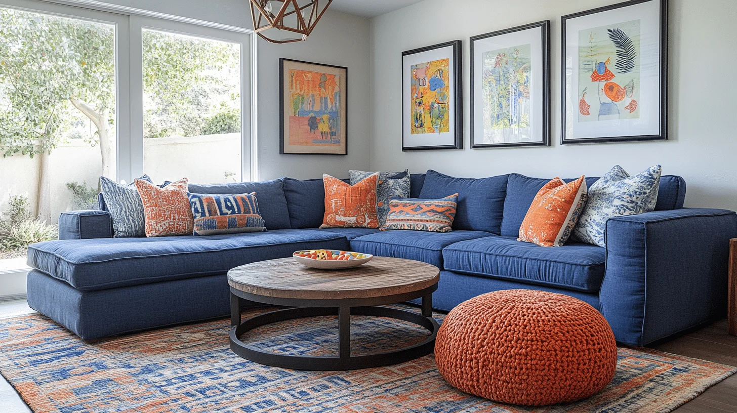 Opt for a navy blue sofa in family rooms to combine style with practicality. The dark fabric conceals stains, while washable, vibrant pillows add a cheerful touch. Pair with sturdy furniture and storage solutions to keep the space organized and kid-friendly.