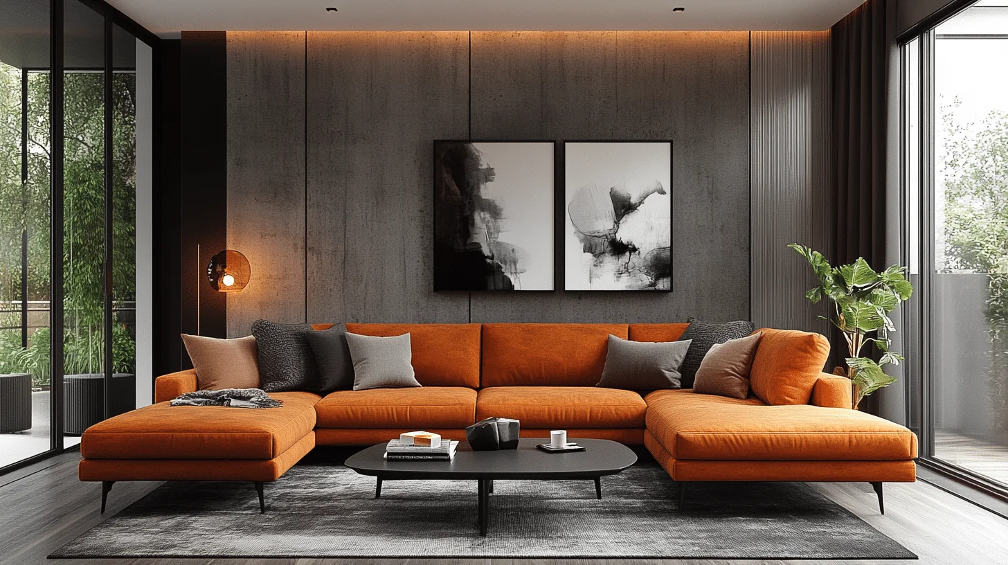 A cinnamon-colored cognac sofa combined with modern furniture and metallic accents creates a stylish and inviting living room. Plush cushions and soft rugs ensure comfort, while mirrors and sleek frames enhance the chic ambiance. This look is perfect for those who appreciate a warm yet contemporary style.