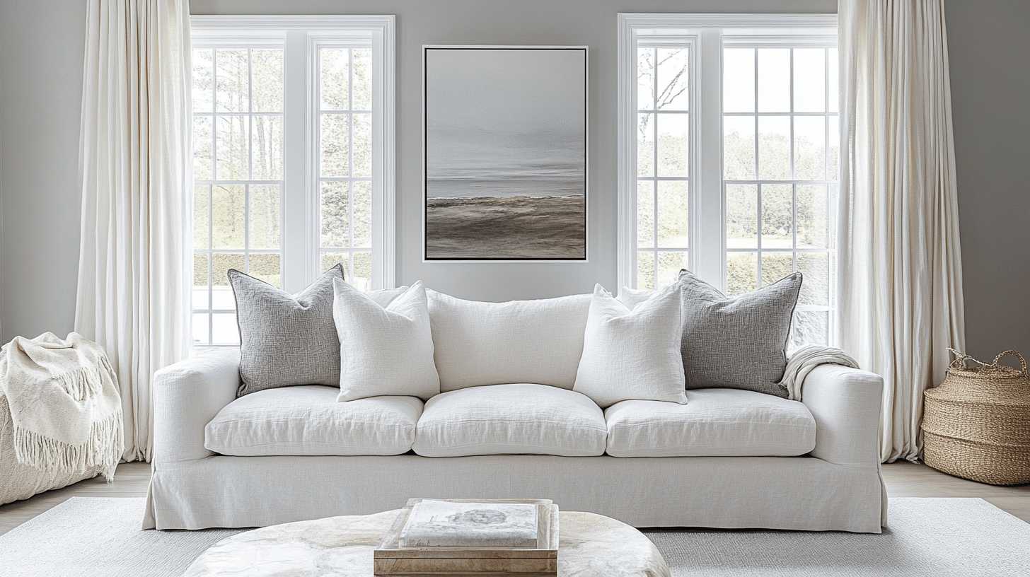 Open up your living area by combining a grey sofa with bright whites, natural fibers, and abundant natural light. Sheer curtains and soft pastel accents enhance the spacious, airy feel, making the room appear larger and more inviting.