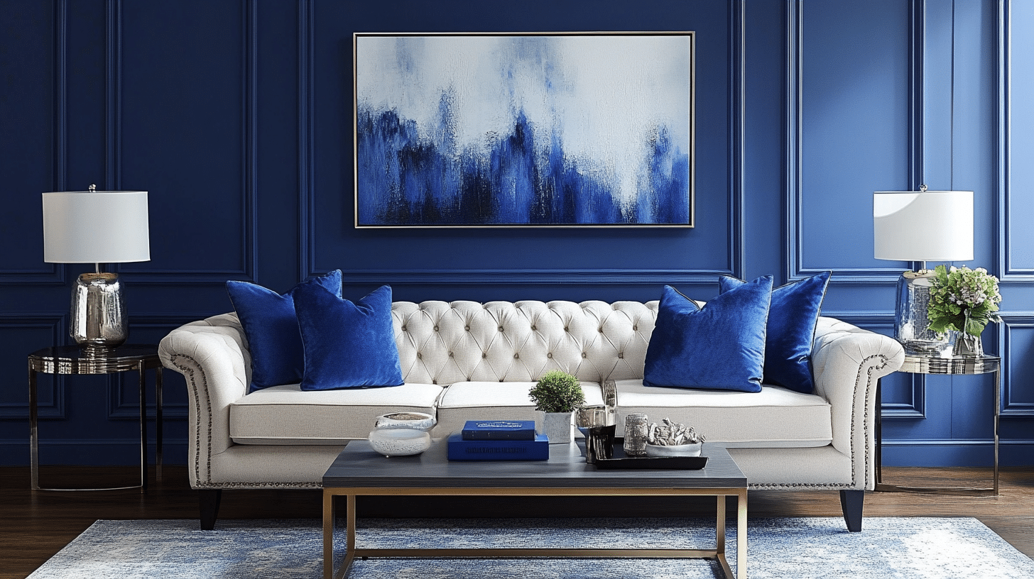 Design a majestic space with deep blue walls complemented by light-colored furnishings. Affordable metallic accents and soft textiles add a modern twist to this classic color scheme. This elegant setting is perfect for both relaxation and entertaining guests.