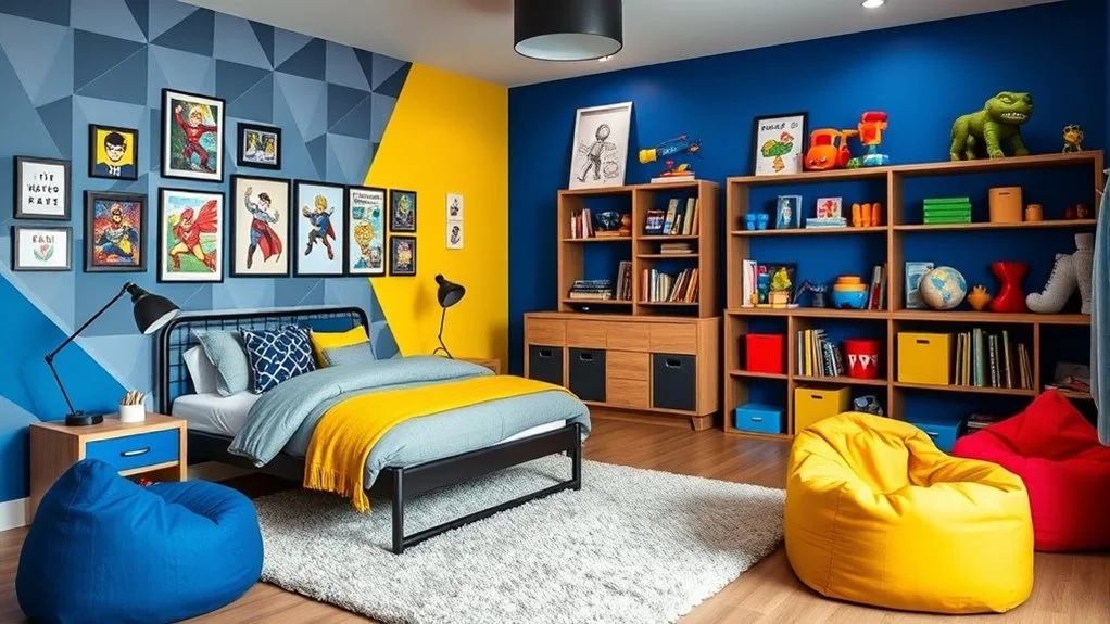 Revamping your son’s bedroom into a vibrant and personalized haven can be both fun and rewarding. By integrating striking color palettes, themed wall art, and sports-inspired accents, you can craft a space that reflects his unique personality. Earthy hues combined with outdoor adventure motifs help establish a soothing environment, while interactive zones and custom name plaques add a distinctive flair. Cleverly showcasing sports gear not only decorates but also motivates. These concepts serve as a springboard to explore even more creative ways to make his room truly one-of-a-kind.