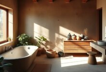 Incorporate native, drought-resistant plants that thrive in your climate and attract local wildlife. This eco-friendly landscaping complements your bathroom’s natural aesthetic, reinforcing the wabi-sabi celebration of imperfection and nature’s resilience.