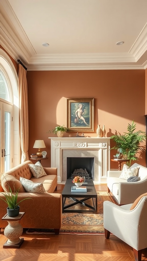 Incorporating greenery and subtle decorative elements further enlivens the room, blending nature with warm tones for a fresh yet inviting ambiance.