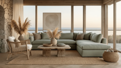 Soft cushions and throws in complementary tones blend seamlessly with woven accents, while greenery introduces freshness. This mix of textures creates a balanced, inviting atmosphere ideal for relaxation.
