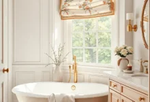 Matte white or soft pink tubs paired with natural wood flooring enhance the warmth. Gold floor-mounted fillers, antique trays for bath essentials, and sconces with mirrors complete the look. Roman shades filter light while ensuring privacy.