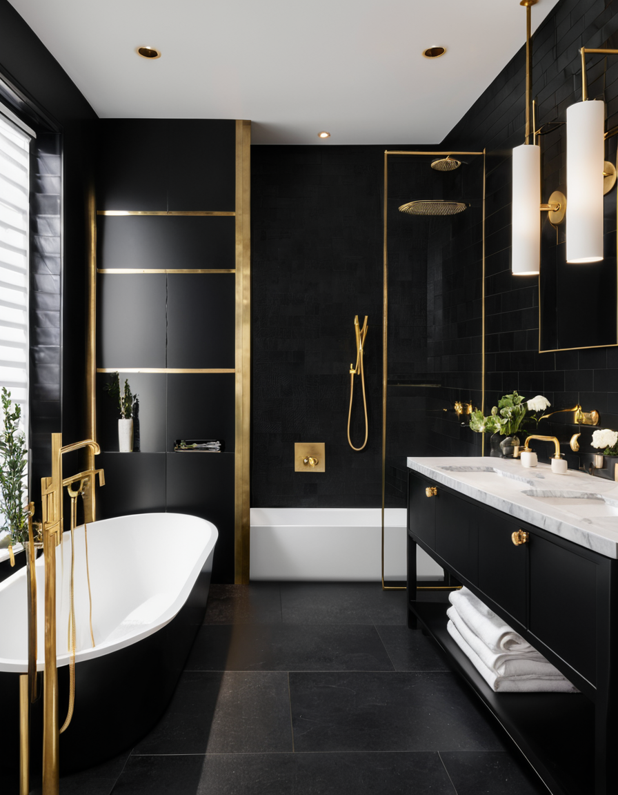 Black bathrooms symbolize modern elegance in 2025. Combining black tiles, fixtures, and accessories with white elements creates a striking, balanced look. Matte or polished black finishes paired with gold or brass accents add warmth and luxury, perfect for those seeking a dramatic yet timeless style.