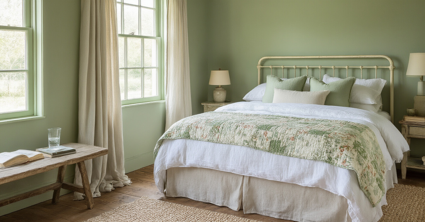Combine cream tones with sage green walls to evoke a cozy farmhouse feel. Add a small side table to hold a scented candle, enhancing the room’s warmth and inviting atmosphere. Layer in textured throws and a plush headboard to complete this comforting and stylish retreat.