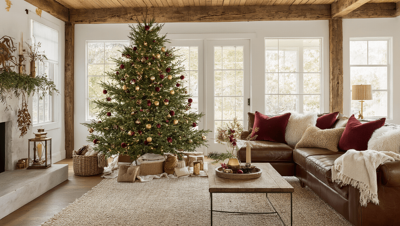 Golden hour light fills a spacious living room with a tall Fraser fir Christmas tree adorned in burgundy and gold ornaments, framed by rustic wooden beams, a leather sofa draped in cream throws, and glowing brass lanterns.