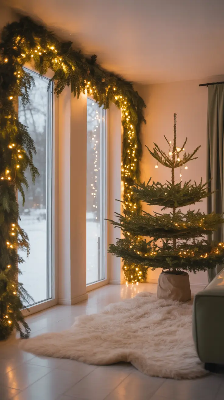 Making a bold statement in 2025, floor-to-ceiling garlands framing windows bring a sophisticated yet minimalist festive flair. This greenery instantly transforms any room, enhancing natural light during the day and glowing warmly at night. Combining faux and real foliage, adorned with lights, ribbons, and ornaments, allows for personalized styling. For a subtle look, simple green garlands with warm fairy lights suffice.