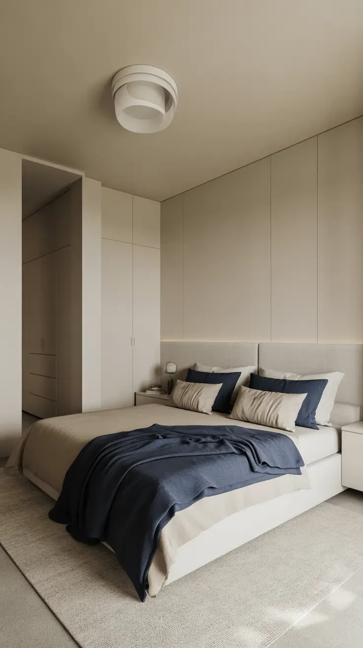 Functionality is paramount in small bedrooms. Built-in wardrobes form the backbone of 2026 design, blending storage with aesthetics. Sliding doors in neutral tones maintain clean sightlines.
